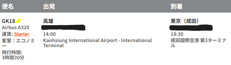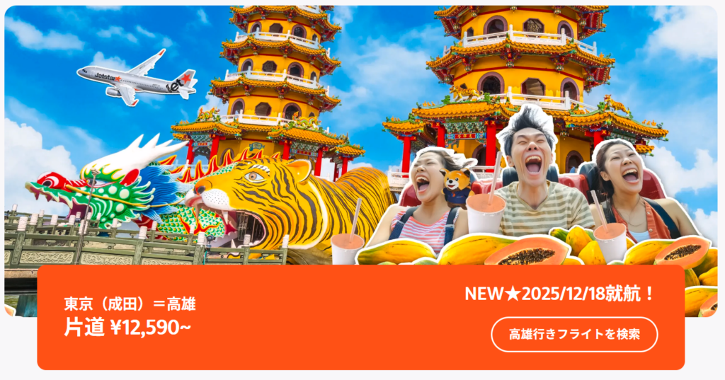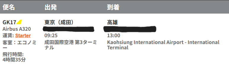 以上がジェットスター東京~高雄便の詳細になります。