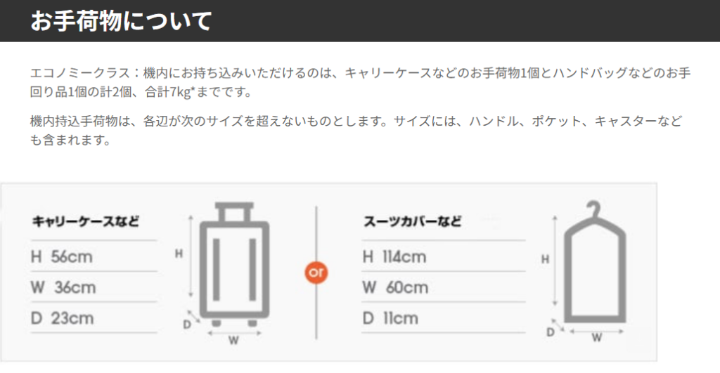 ●機内持ち込み手荷物7kgまで(大きいもの、座席下に入る小さいものの2つまで)