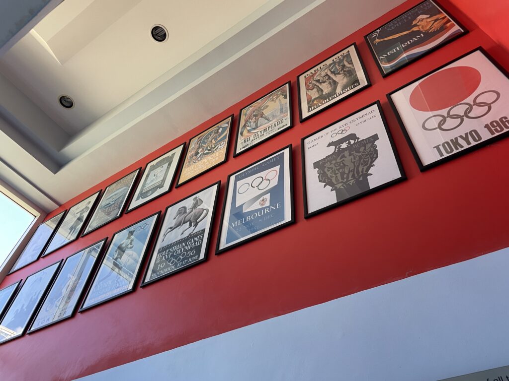 過去のオリンピックの公式ポスターが展示されています。右下には1964年の東京オリンピックのポスターが見えますね!