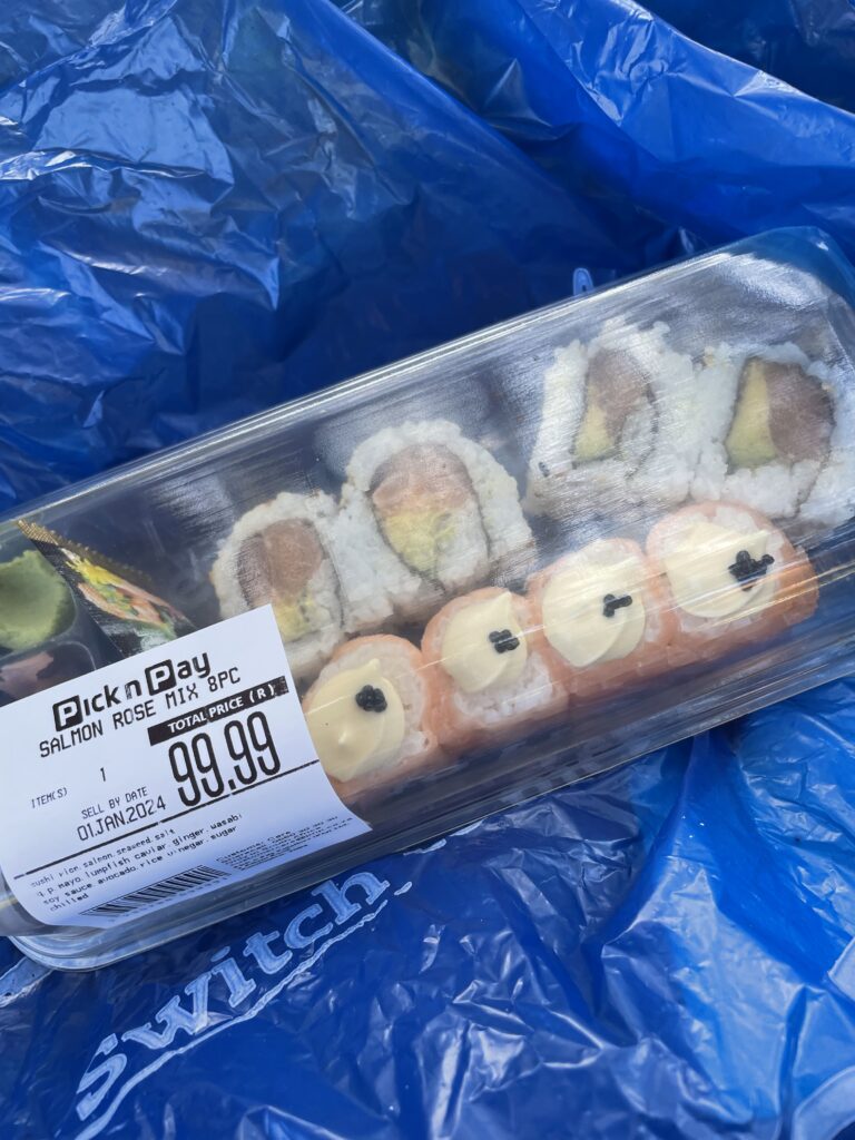 お値段は2024年1月当時で、99.99南アフリカランド、日本円にして約800円くらい(2024年9月時点のレートで)なので日本のスーパーで売っている寿司の値段とほぼ同じイメージです。